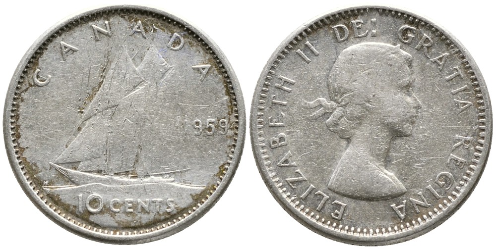 Канада 10 центов 1959 ЕЛИЗАВЕТА II (1952-), ПАРУСНИК, ПЕРВЫЙ ПОРТРЕТ KM 51 серебро 4532-756