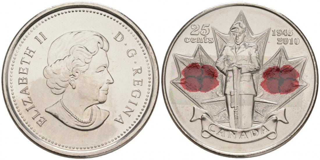 Канада 25 центов 2010 65 лет победы во Второй мировой войне, цветная эмаль KM 1028 никелированная сталь UNC M32-03