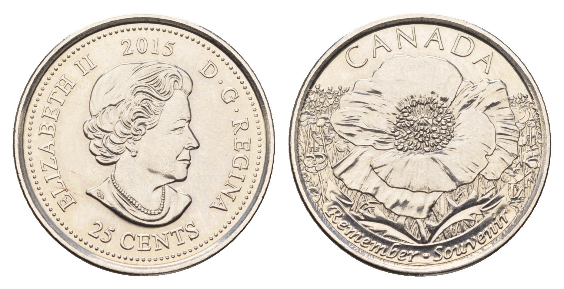 Канада 25 центов 2015 100 лет стихотворению "На полях Фландрии" KM 1852.1 сталь плакированная никелем UNC 110-421