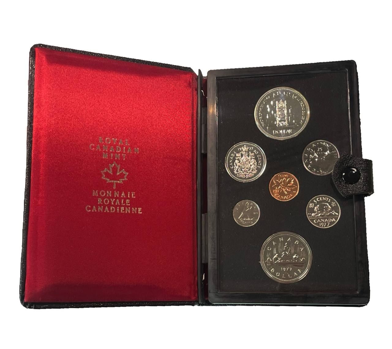 Канада набор из 7 монет (1, 5, 10, 25 и 50 центов; 1 доллар) 1977 25 лет вступлению на престол Королевы Елизаветы II, в оригинальной упаковке, с сертификатом подлинности KM 59, 60.1, 77, 62b, 75.2, 117 и 118 BU 8-1-03-11