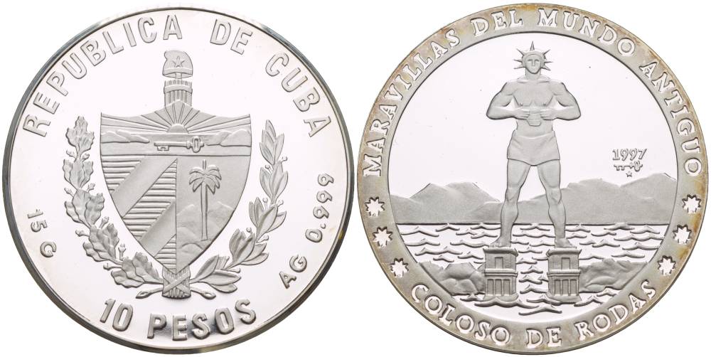Куба 10 песо 1997 серия семь чудес света, колосс Родосский KM 596 серебро PROOF 02-037-43