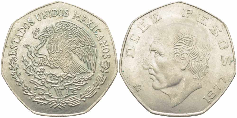 МЕКСИКА 10 ПЕСО 1977 МИГЕЛЬ ХИДАЛЬГО КАСТИЛЬЯ KM 477.1 медно-никель 111-321