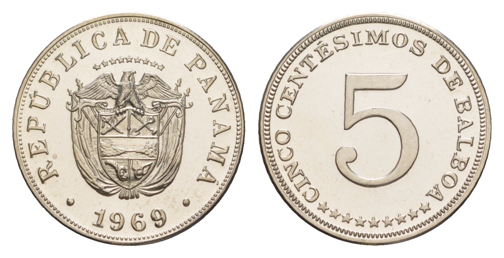 Панама 5 сентесимо 1969 тираж 14.000 экземпляров KM 23.2 медно-никель PROOF 1524-724