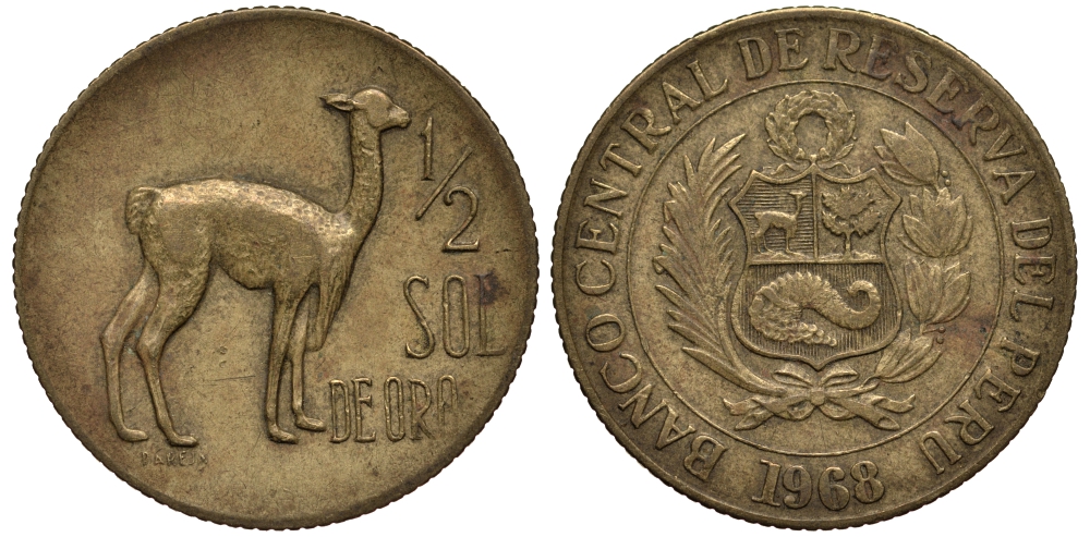 ПЕРУ 1/2 СОЛЯ 1968 ЛАМА KM 247 латунь 4182-327