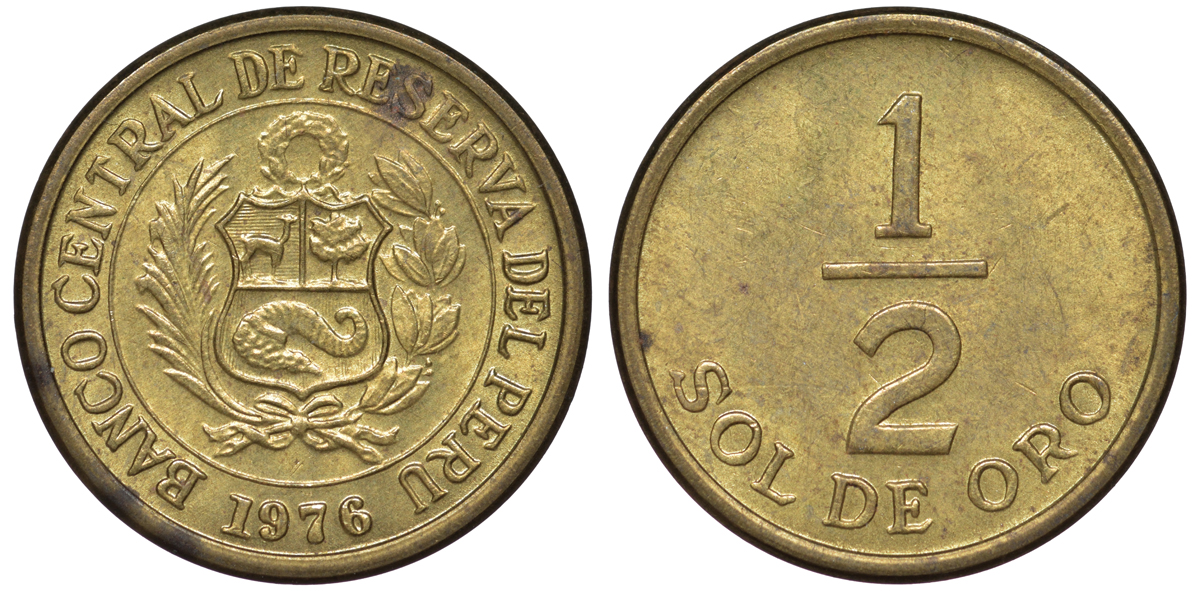 Перу 1/2 соля 1976 KM 265 латунь 4189-959