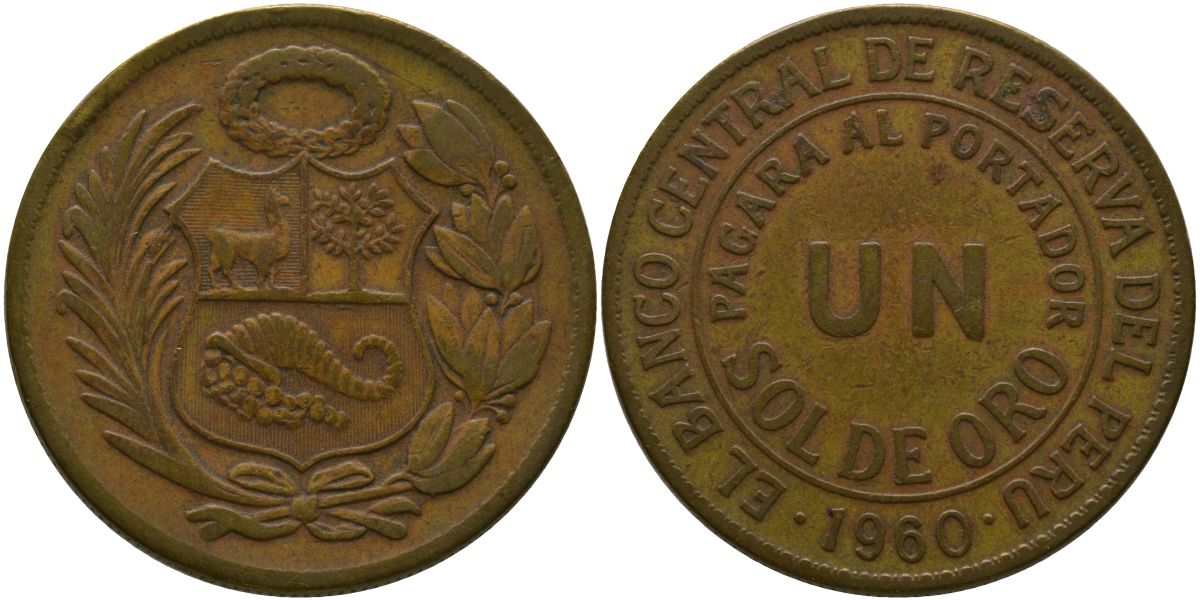 Перу 1 соль 1960 KM 222, Schon 24 латунь 4565-421