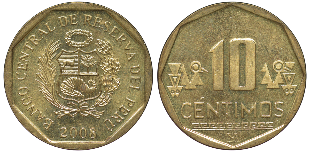 Перу 10 сентимо 2008 KM 305.4 латунь aUNC 4605-537