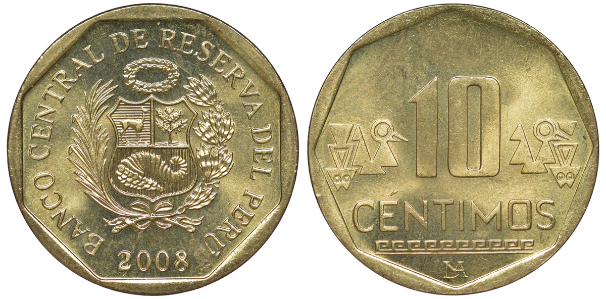Перу 10 сентимо 2008 KM 305.4 латунь aUNC 4605-541