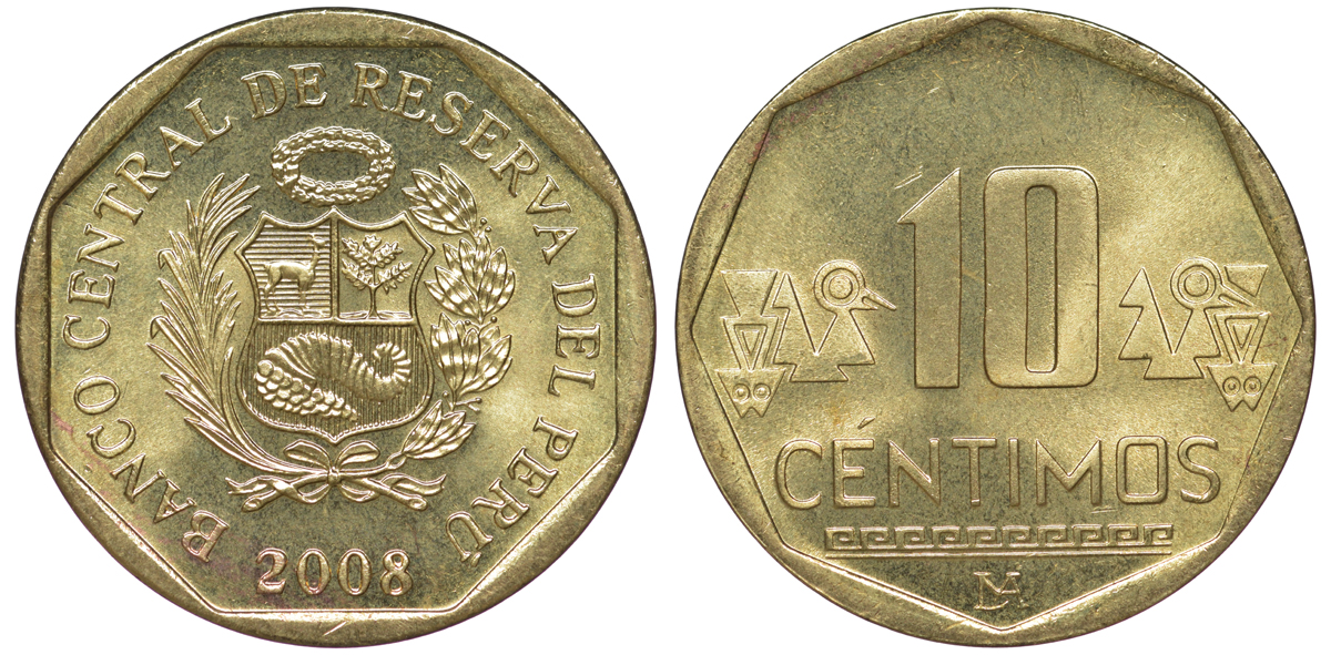 Перу 10 сентимо 2008 KM 305.4 латунь aUNC 4605-542