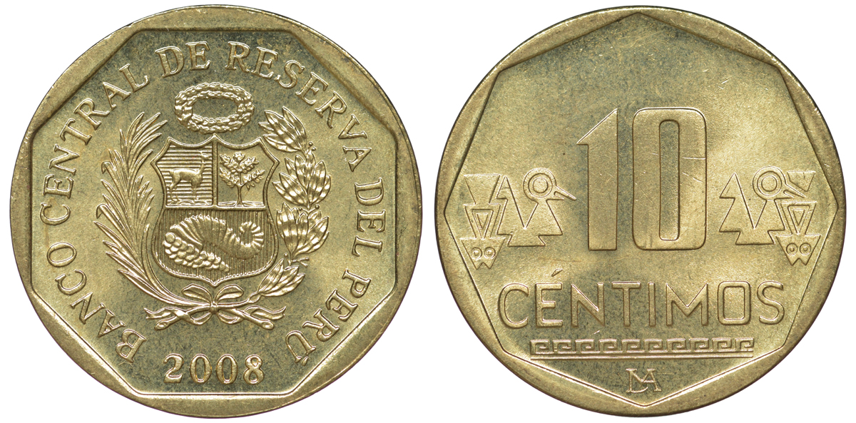 Перу 10 сентимо 2008 KM 305.4 латунь aUNC 4605-611