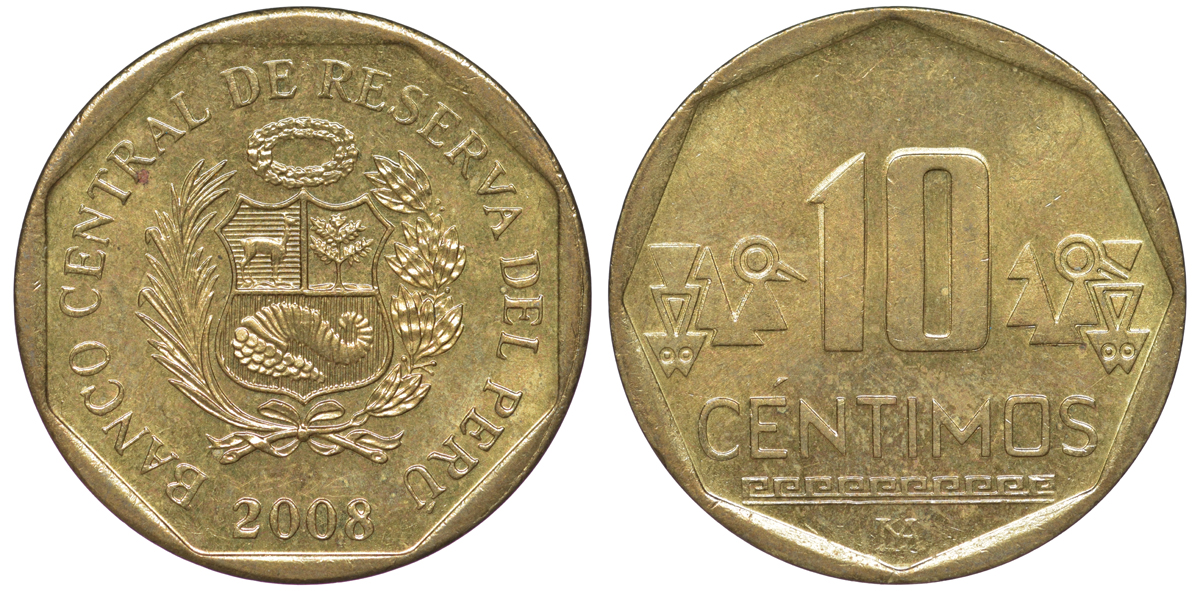 Перу 10 сентимо 2008 KM 305.4 латунь aUNC 4605-613