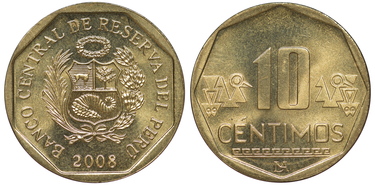 Перу 10 сентимо 2008 KM 305.4 латунь aUNC 4605-631