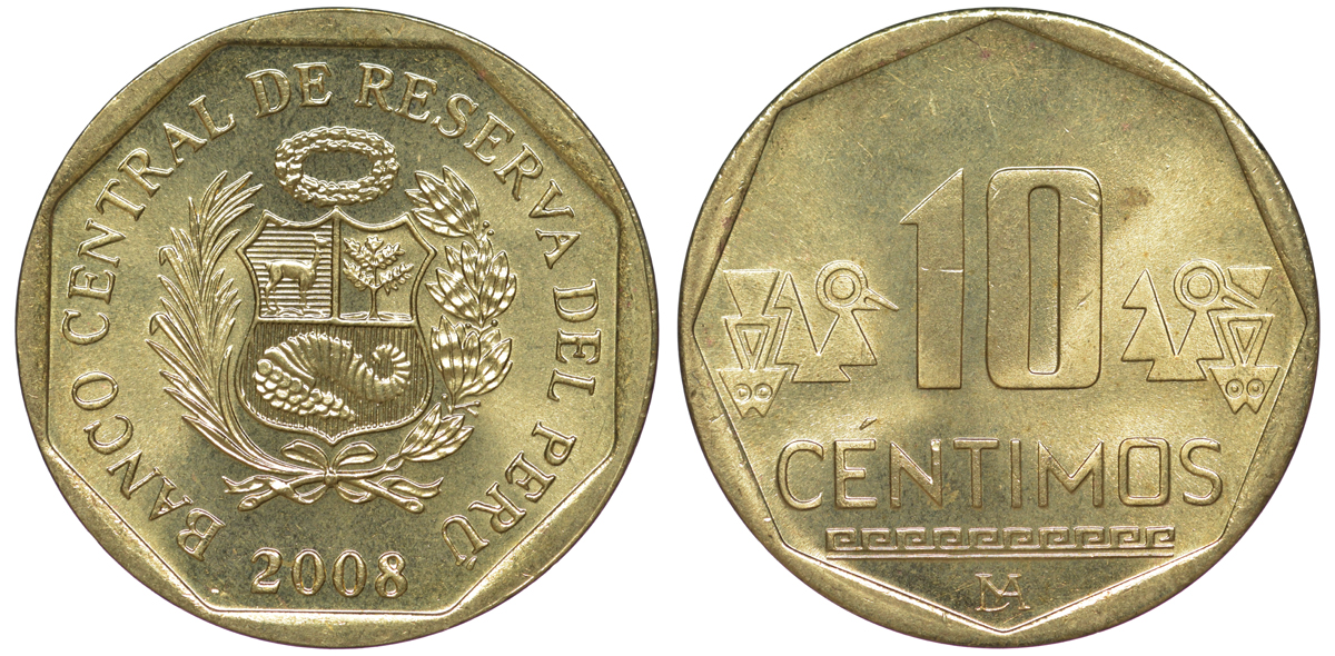 Перу 10 сентимо 2008 KM 305.4 латунь aUNC 4605-632