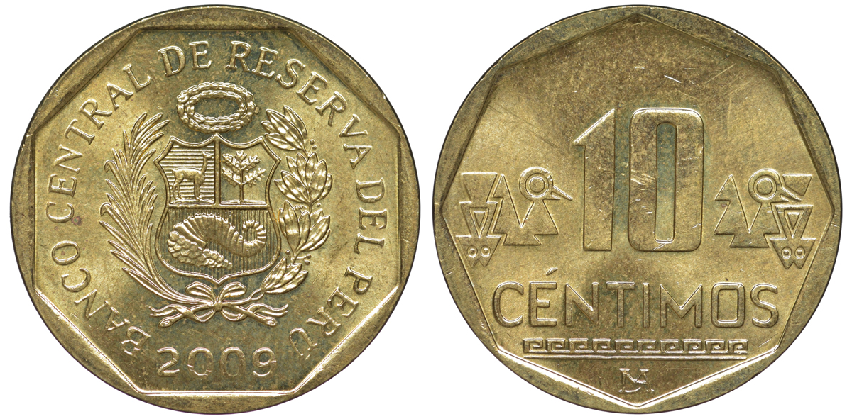 Перу 10 сентимо 2009 KM 305.4 латунь aUNC 4605-636