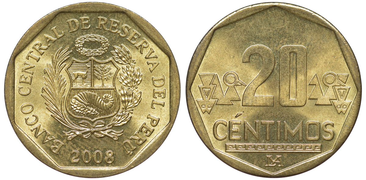 Перу 20 сентимо 2008 KM 306.4 латунь aUNC 4605-443