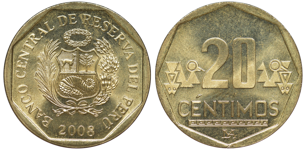 Перу 20 сентимо 2008 KM 306.4 латунь aUNC 4605-444