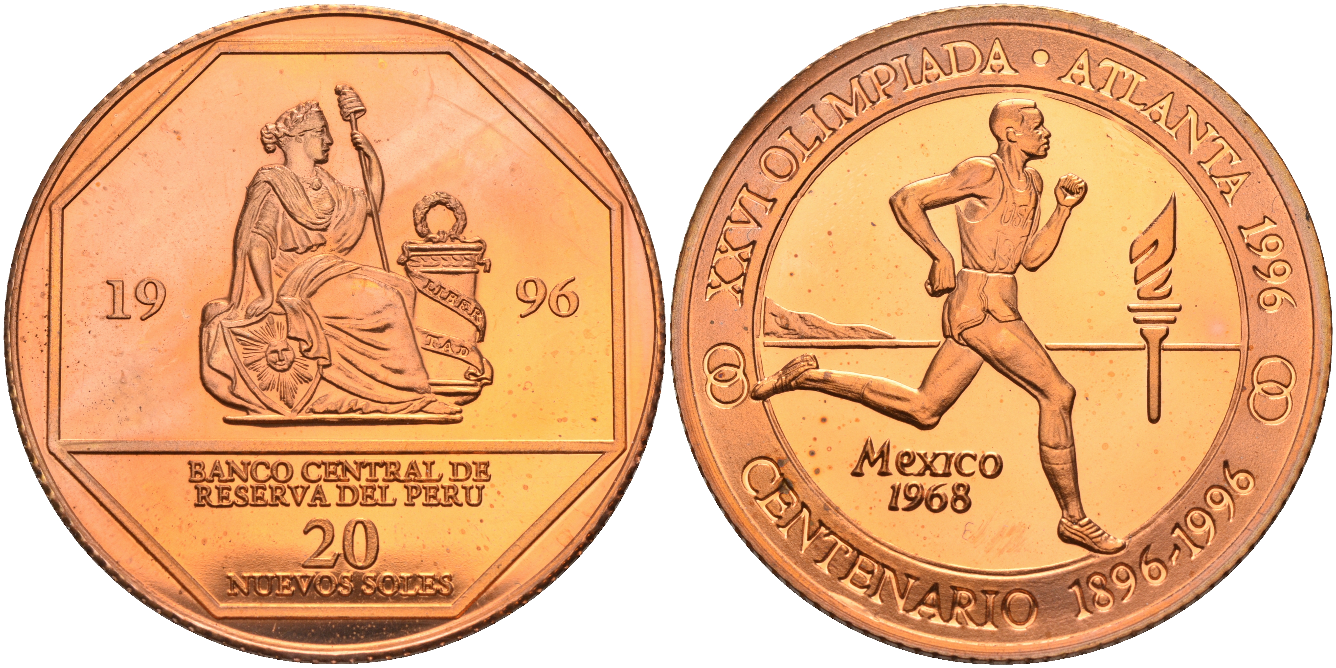 Перу 20 солей 1996 XXVI Олимпийские игры 1996 года в Атланте, 100 лет Олимпийскому движению, бег, пробник, рубчатый гурт медь PROOF 06-134-43