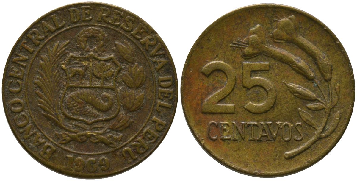 Перу 25 сентаво 1969 KM 246.2, Schon 51 латунь 4532-627