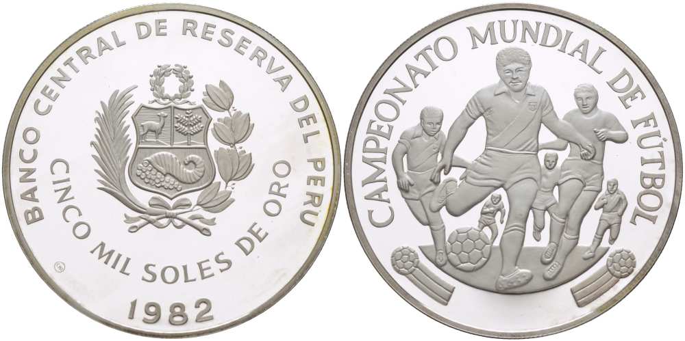 Перу 5000 солей 1982 чемпионат мира по футболу 1982 года в Испании, атака KM 284 серебро PROOF 01-149-41