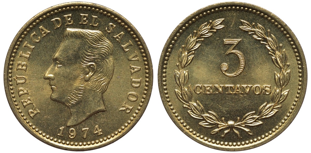 Сальвадор 3 сентаво 1974 год тип, Франсиско Морасан KM 148 никель-латунь UNC M21-10