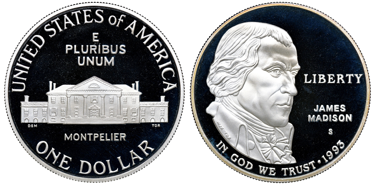 США 1 доллар 1993 S, Джеймс Мэдисон, Билль о правах, в оригинальной коробке KM 241 серебро PROOF 00-000-00