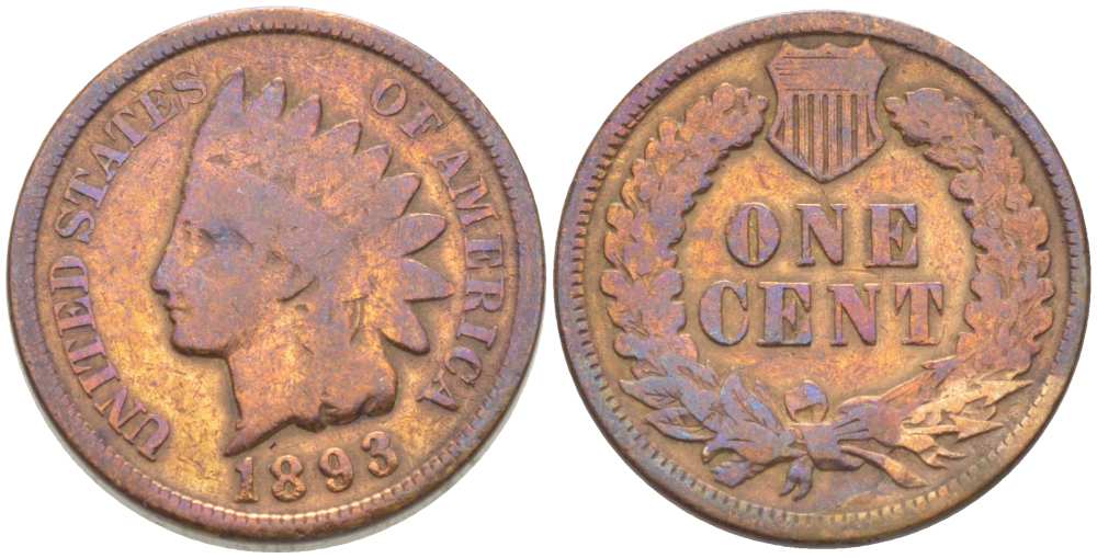 США 1 ЦЕНТ 1893 ИНДЕЕЦ KM 90а бронза 218-323