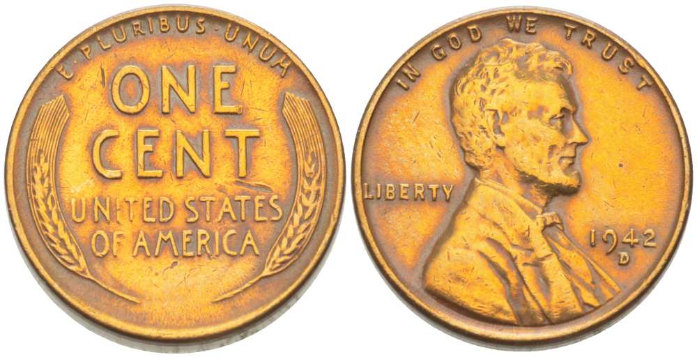 США 1 ЦЕНТ 1942 D, ЛИНКОЛЬН KM 132 бронза 3309-456