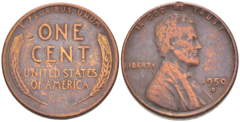 США 1 ЦЕНТ 1950 D, ЛИНКОЛЬН KM А132 медь цинк 3309-555
