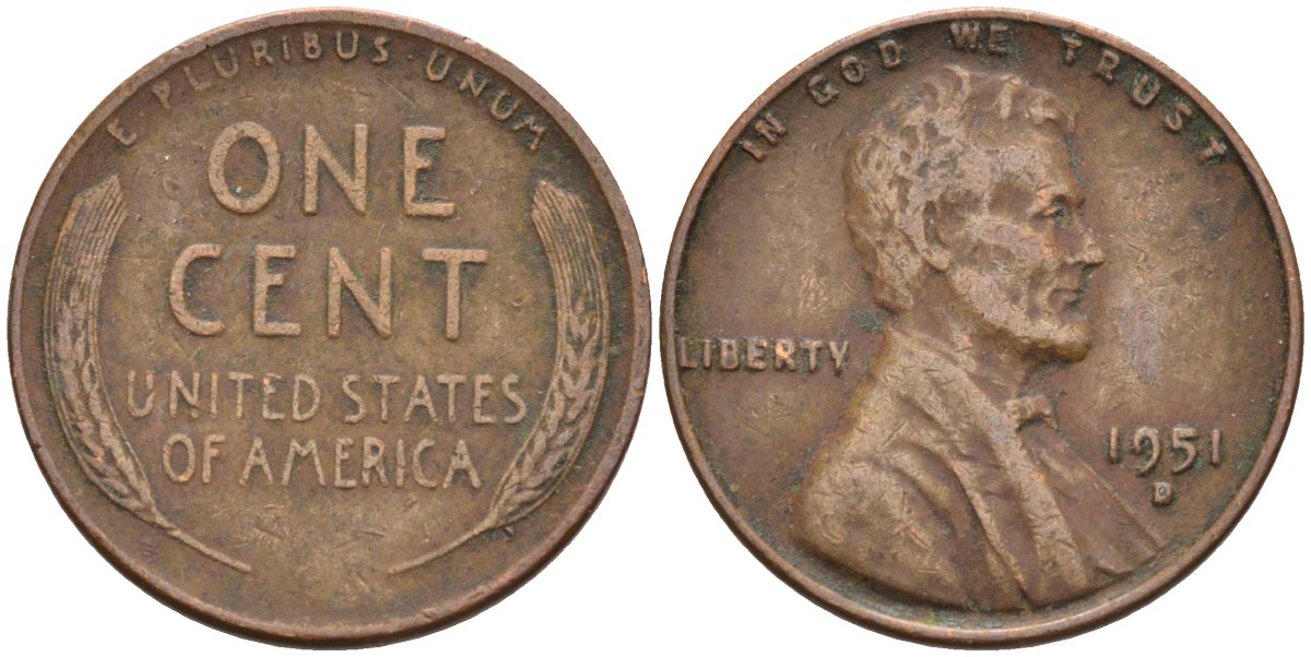 США 1 цент 1951 D, Линкольн KM А132 медь цинк 4115-813