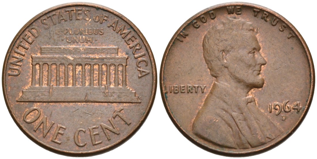 США 1 цент 1964 D, Линкольн KM 201 медь цинк 4564-437
