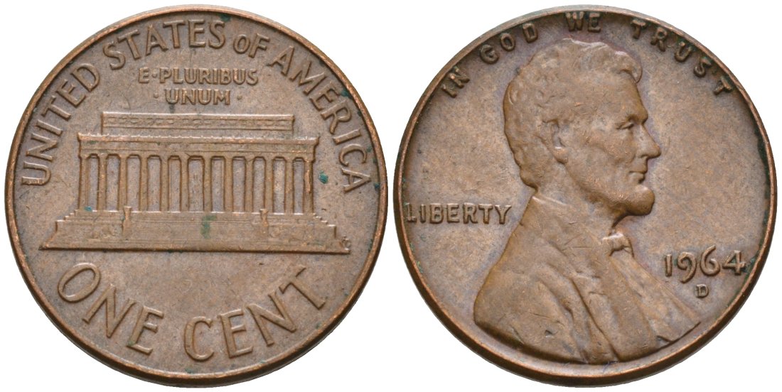 США 1 цент 1964 D, Линкольн KM 201 медь цинк 4564-438
