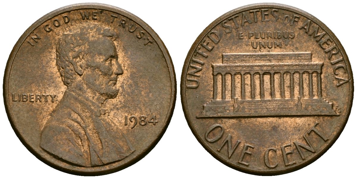 США 1 цент 1984 Линкольн KM 201b цинк плакированный медью 4136-252