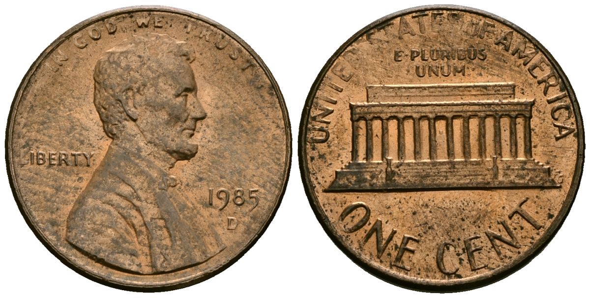 США 1 цент 1985 D, Линкольн KM 201b цинк плакированный медью 4136-262