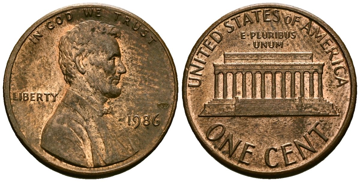 США 1 цент 1986 Линкольн KM 201b цинк плакированный медью 4136-319