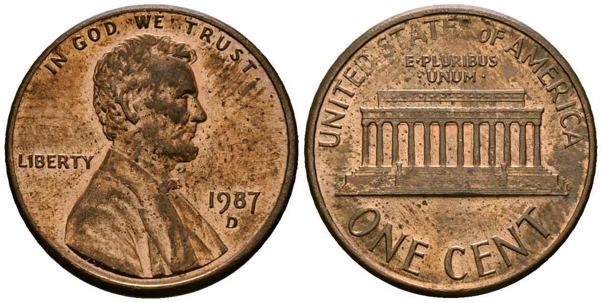 США 1 цент 1987 D, Линкольн KM 201b цинк плакированный медью 4136-324