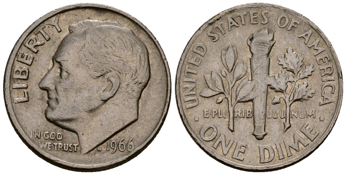 США 10 центов (дайм) 1966 Рузвельт KM 195a медь плакированная медно-никелем 4164-927