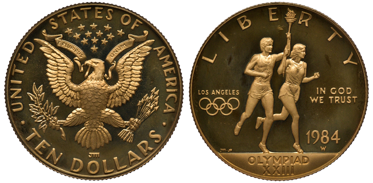США 10 долларов 1984 W, XXIII летние Олимпийские игры в Лос-Анджелесе 1984 года, факелоносцы KM 211 золото PROOF 10-014-47