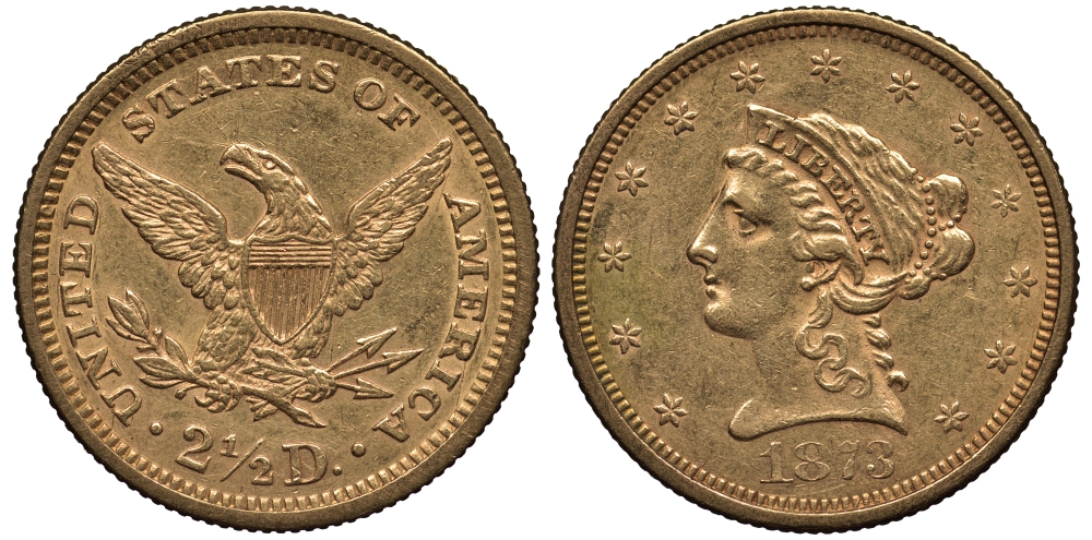 США 2 1/2 доллара 1873 голова Свободы золото 00-000-00