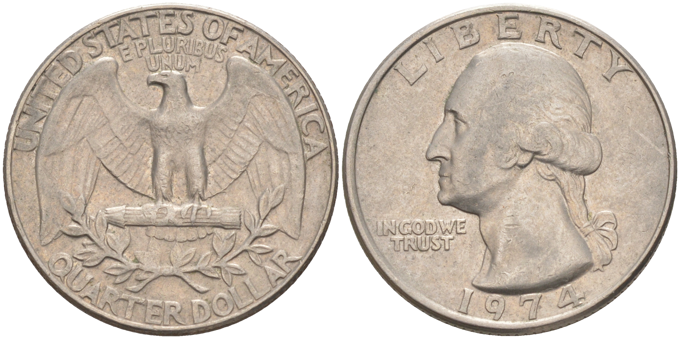 США 25 центов (квотер) 1974 Вашингтон KM 164a медь плакированная медно-никелем 4114-813