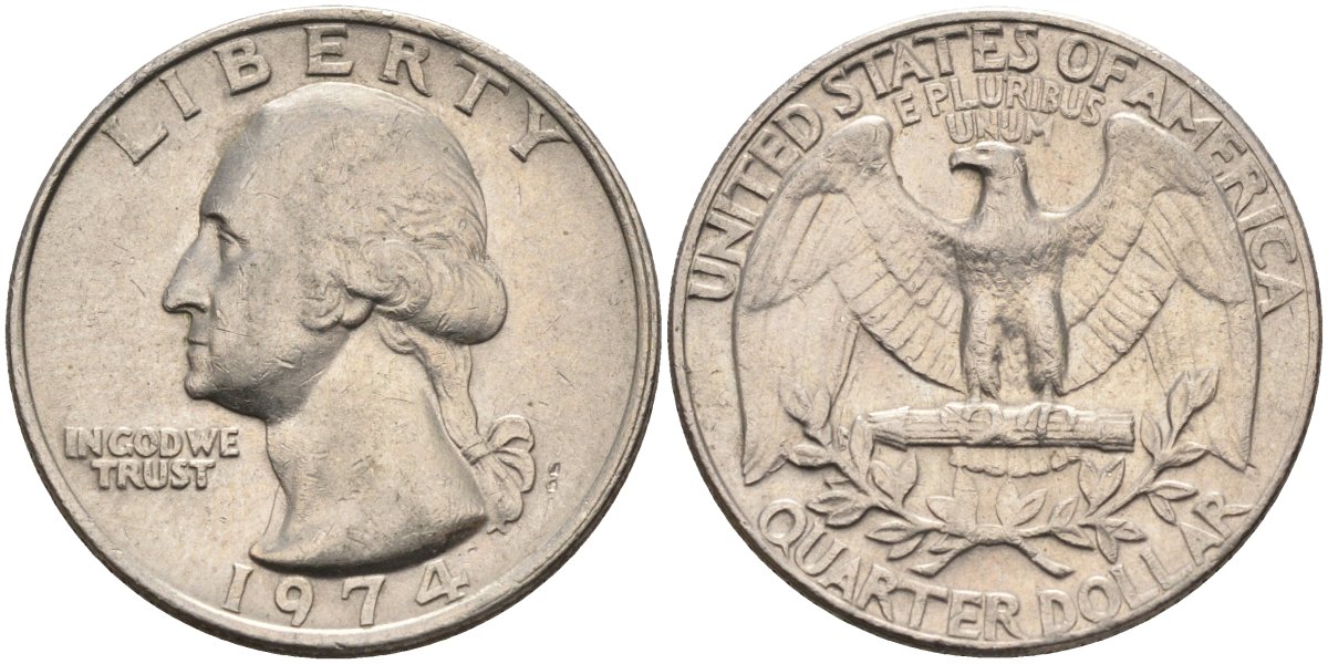 США 25 центов (квотер) 1974 Вашингтон KM 164a медь плакированная медно-никелем 4584-1036
