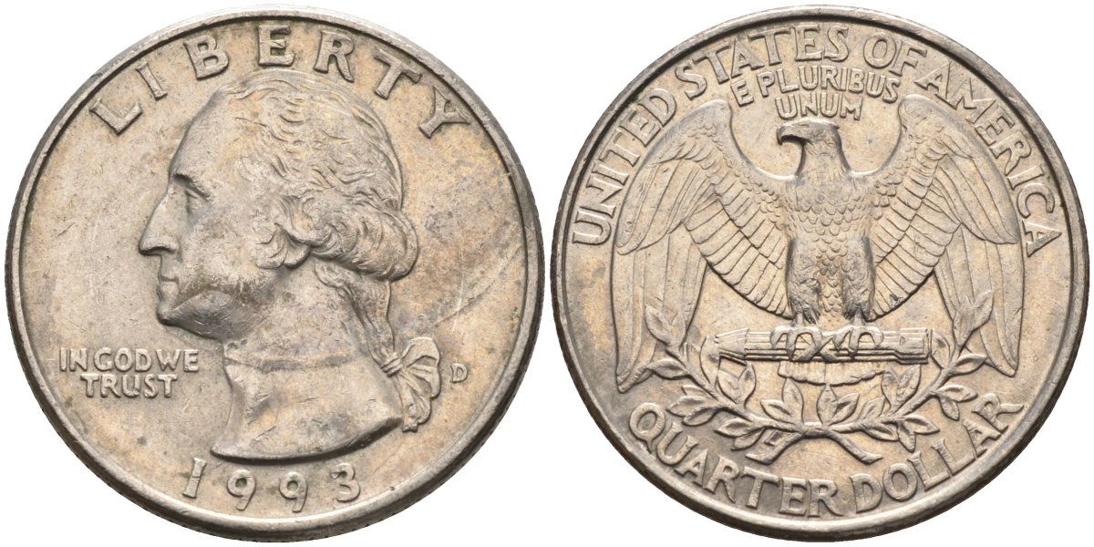 США 25 центов (квотер) 1993 D, Вашингтон KM A164a медь плакированная медно-никелем 113-1013