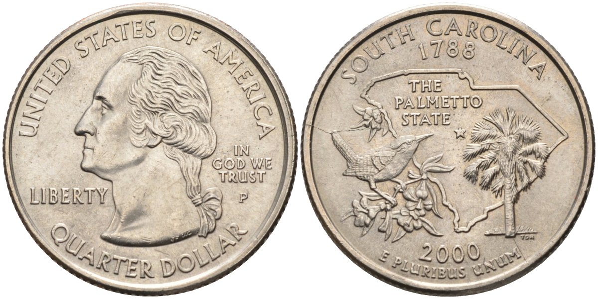 США 25 центов = квотер 2000 P, серия штаты США, Южная Каролина KM 307 медь плакированная медно-никелем 4586-131