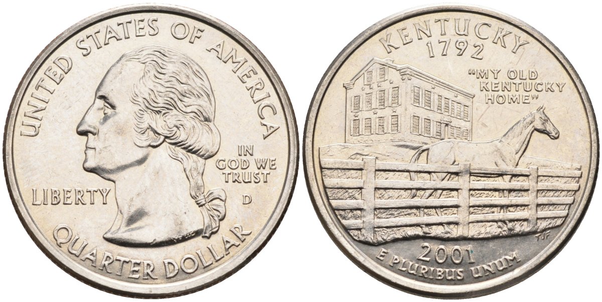 США 25 центов = квотер 2001 D, серия штаты США, Кентукки KM 322 медь плакированная медно-никелем 4586-153