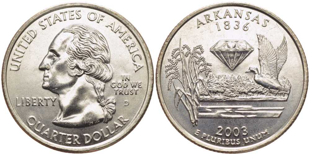 США 25 центов = квотер 2003 D, серия штаты США, штат Арканзас KM 347 медь плакированная медно-никелем UNC M20-1
