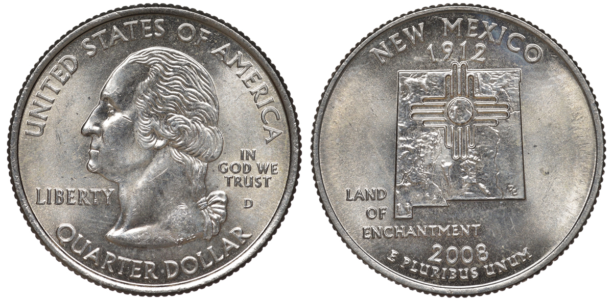 США 25 центов = квотер 2008 D, серия штаты США, Нью-Мексико KM 422 медь плакированная медно-никелем 4525-216