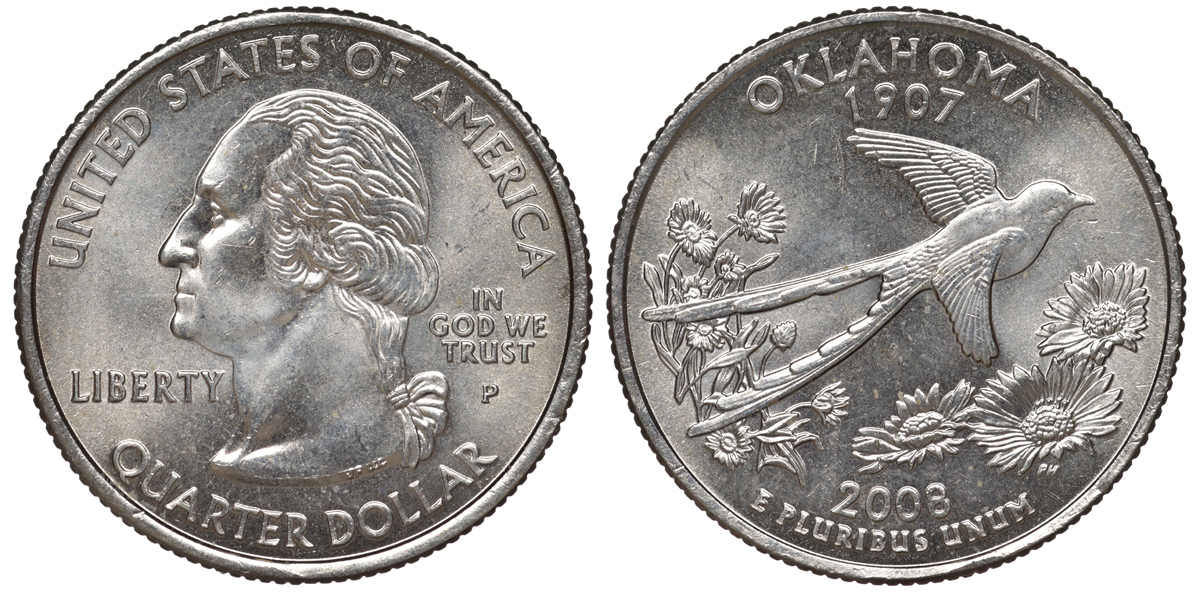 США 25 центов = квотер 2008 P, серия штаты США, Оклахома KM 421 медь плакированная медно-никелем 4525-443