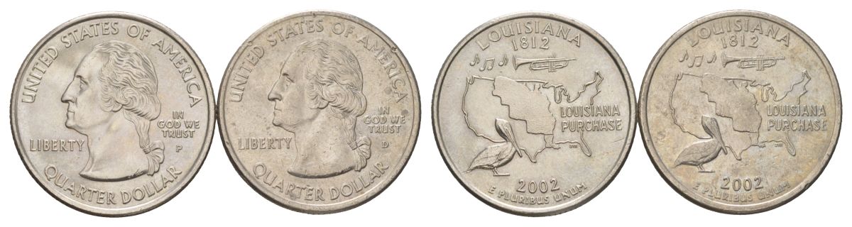 США набор обоих монетных дворов 25 центов (квотер, 1/4 доллара) 2002 D и P, Квотер штата Луизиана KM 333 медь плакированный медно-никелем UNC 4628-1231-1232