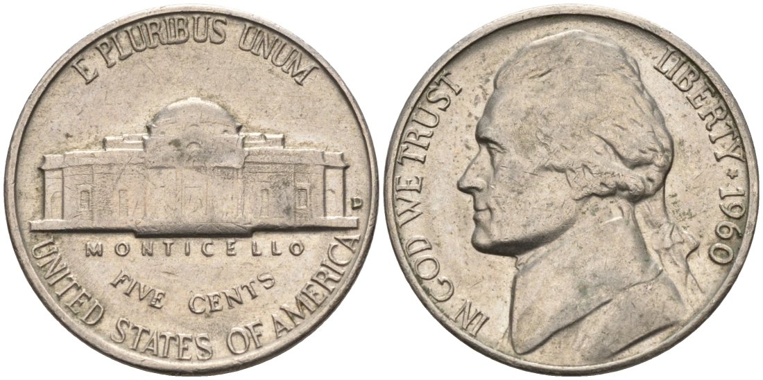 США 5 центов 1960 D, Джефферсон KM А192 медно-никель 92-1037