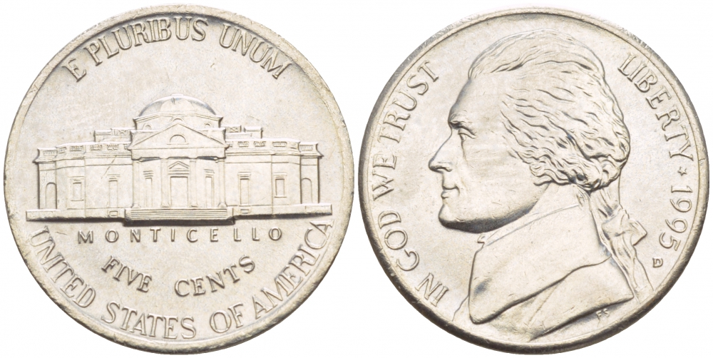 США 5 ЦЕНТОВ 1995 D, ДЖЕФФЕРСОН KM А192 медно-никель 4546-1224