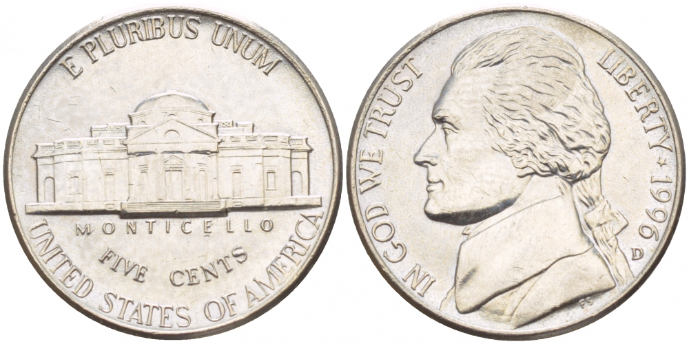 США 5 ЦЕНТОВ 1996 D, ДЖЕФФЕРСОН KM А192 медно-никель 4546-1225